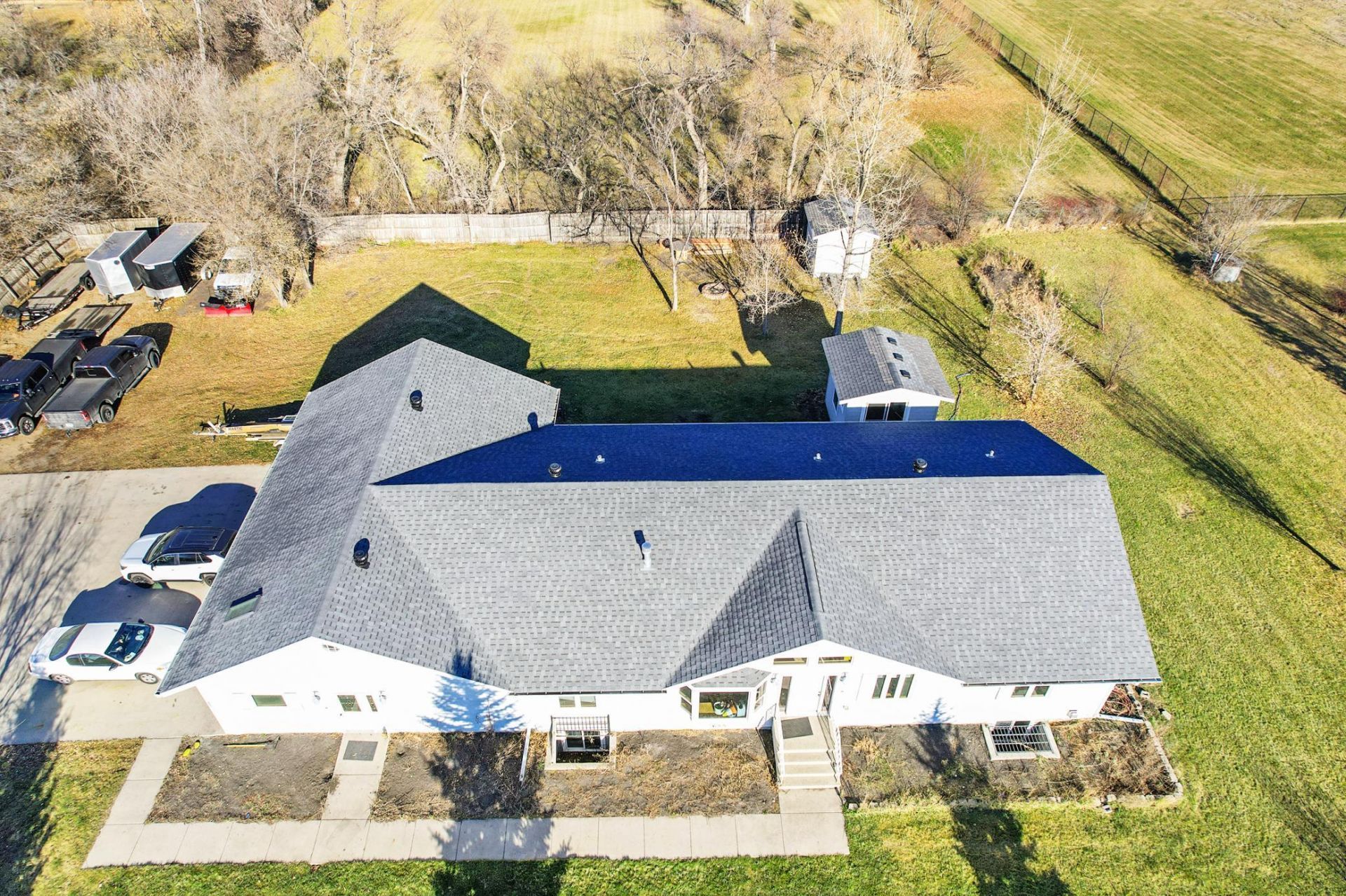 Hard to find 1.5+ acres in town! This sprawling one-story home offers over 4,000 finished square feet with room to live, work, and entertain both inside and out. Featuring 6 bedrooms and 4 bathrooms, this home delivers space in all the right places. The main level offers a spacious living room with a double-sided gas fireplace, open-concept kitchen and dining area, and a private primary suite with walk-in closet and en suite bath. You'll also find a full guest bath, convenient rear foyer with half bath, and washer/dryer included. The basement has been newly finished, adding significant living space with additional bedrooms, bathrooms, and a large family room. Step outside to your expansive yard and enjoy the outdoor addition featuring a hot tub, with plenty of room for future outbuildings or expansion. The attached 2-stall garage includes in-floor heat plus a versatile third-stall area ideal for a workshop, hobby space, or home office.